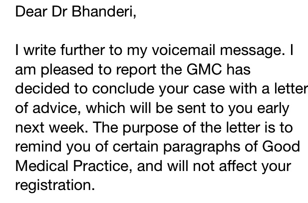 He contacted his defence organisation immediately. He wanted it to all go away. He wanted to admit he made a mistake and apologise in order to try and sort it out as soon as possible. “They were brilliant, the advisor and solicitor told me not to reply and to let them converse with the GMC. They said it would be a year or so for the case to be concluded”